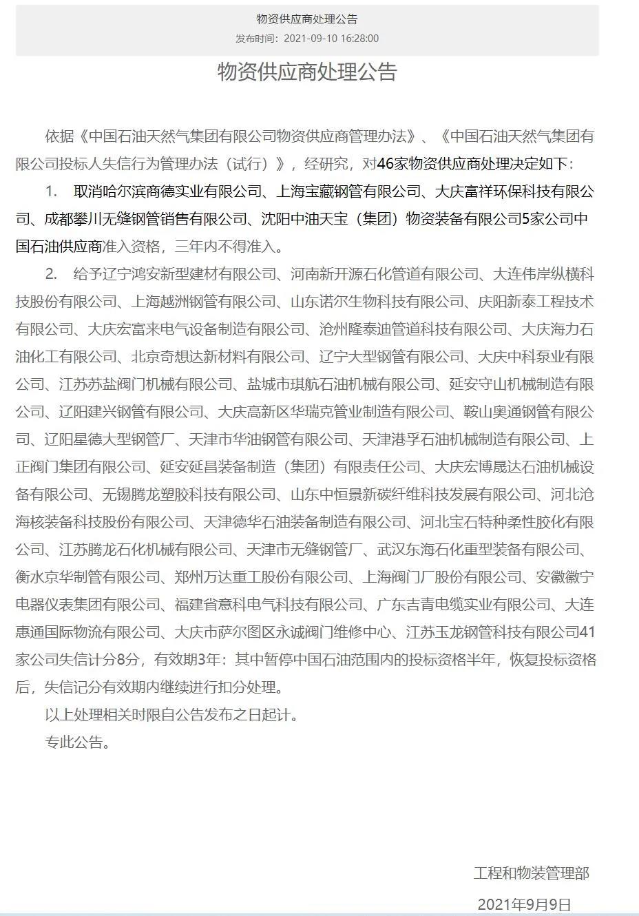 依據《中國石油天然氣集團有限公司物資供應商管理辦法》、《中國石油天然氣集團有限公司投標人失信行為管理辦法(試行)》,經研究,對46家物資供應商處理決定如下: