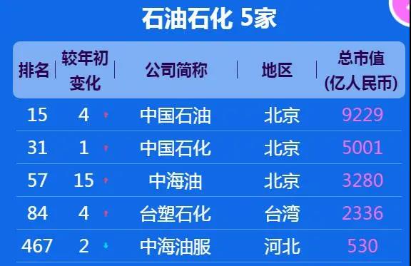 石油石化行業(yè)有5家進(jìn)入500強(qiáng),中國(guó)石油總市值為9229億元,位居行業(yè)第一;中國(guó)石化為5001億元;中海油為3280億元;臺(tái)塑臺(tái)化2336億元;中海油服530億元。