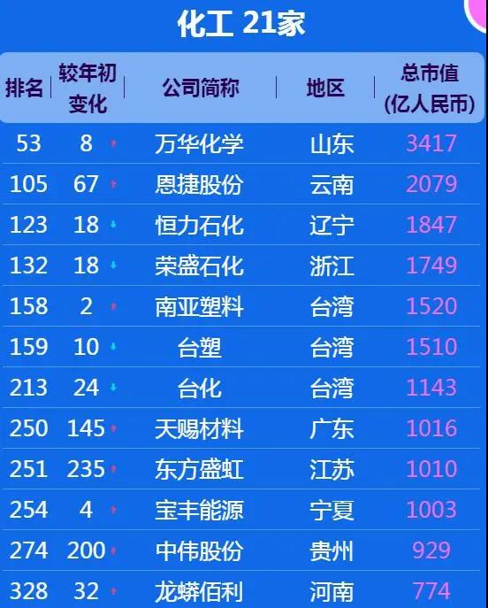化工行業(yè)有21家進(jìn)入500強(qiáng),市值破千億元的有:萬華化學(xué)總市值為3417億元;恩捷股份為2079億元;恒力股份為1847億元;榮盛石化為1749億元;南亞塑料為1520億元;臺(tái)塑為1510億元;臺(tái)化為1143億元;天賜材料為1016億元;東方盛虹為1010億元;寶豐能源為1003億元。