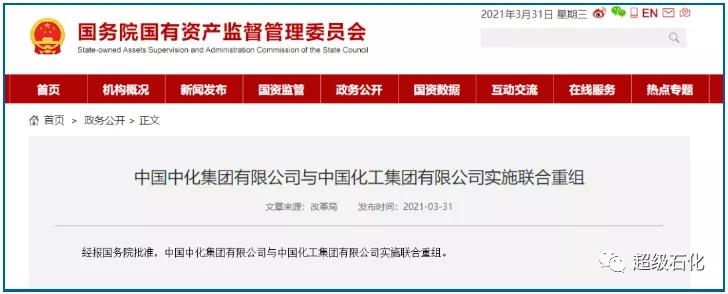 3月31日,經國務院批準,中國中化集團有限公司(以下簡稱“中化集團”)與中國化工集團有限公司(以下簡稱“中國化工”)實施聯合重組,新設由國務院國有資產監督管理委員會代表國務院履行出資人職責的新公司,中化集團和中國化工整體劃入新公司。此次聯合重組將更好地整合資源、發揮協同效應,打造世界一流的綜合性化工企業,促進我國化學工業高質量發展。