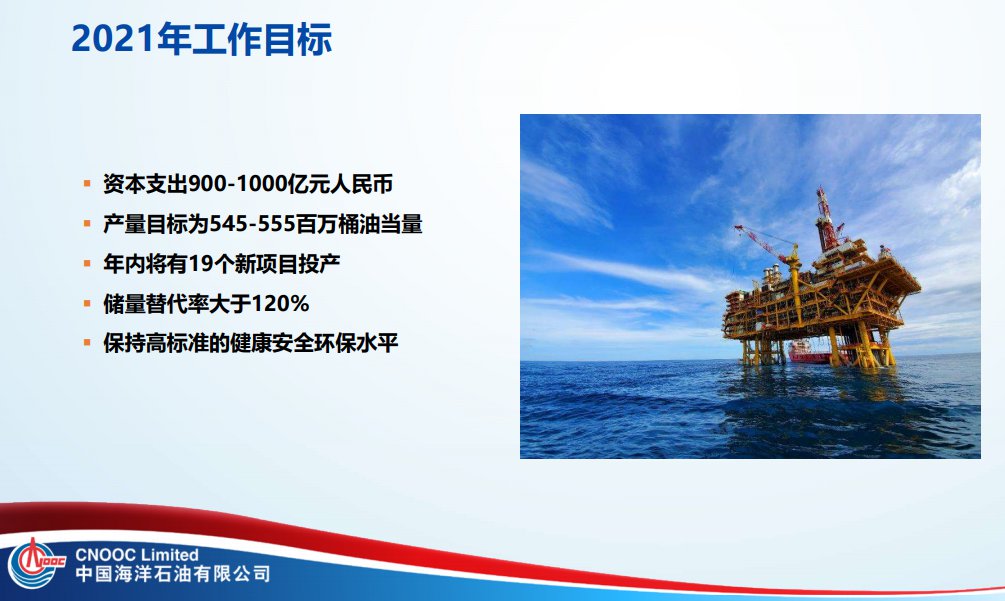 在勘探與生產(chǎn)業(yè)務(wù)方面,公司將加強(qiáng)風(fēng)險(xiǎn)勘探,突出重點(diǎn)區(qū)域集中勘探。2021年集團(tuán)公司計(jì)劃原油產(chǎn)量為923.5百萬(wàn)桶,可銷(xiāo)售天然氣產(chǎn)量為4,354.0十億立方英尺,油氣當(dāng)量合計(jì)為1,649.4百萬(wàn)桶。