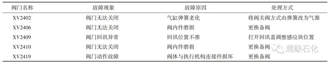某石化公司S Zorb裝置上一生產(chǎn)周期主要程控閥故障及處理方式見表1。依照經(jīng)驗(yàn)制定針對(duì)性預(yù)防性維護(hù)措施。針對(duì)設(shè)備的特性和工況制定周期性的定期維護(hù)方案,降低設(shè)備故障發(fā)生頻率。