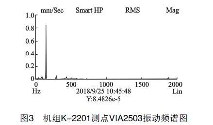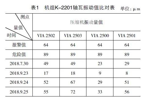 富氣壓縮機K-2201在2018年9月23日大檢修后第一次開機運行,機組軸系各部振動均在正常范圍內,各軸瓦振動值均不超過20μmm,檢修情況良好。