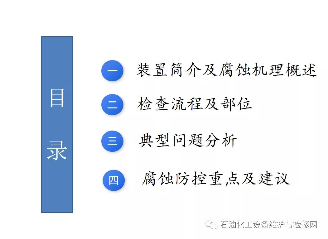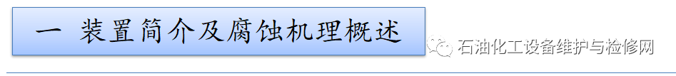 腐蝕流程:常減壓裝置,低溫HCl+H2S+H2O腐蝕,以及高溫部位的高溫硫和環(huán)烷酸腐蝕;焦化裝置,分餾系統(tǒng)低溫部位的H2S+HCI+NH3+H2O腐蝕以及銨鹽垢下腐蝕。
