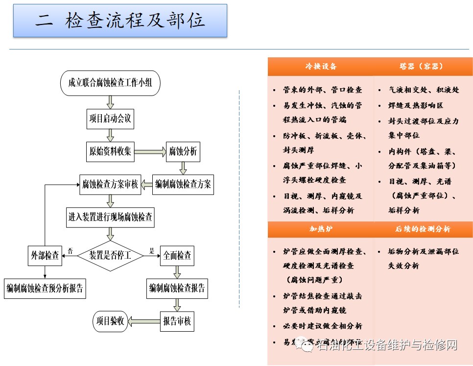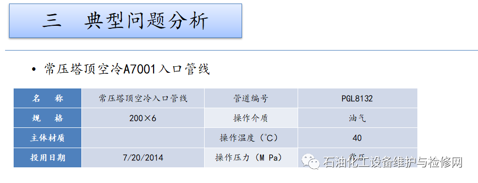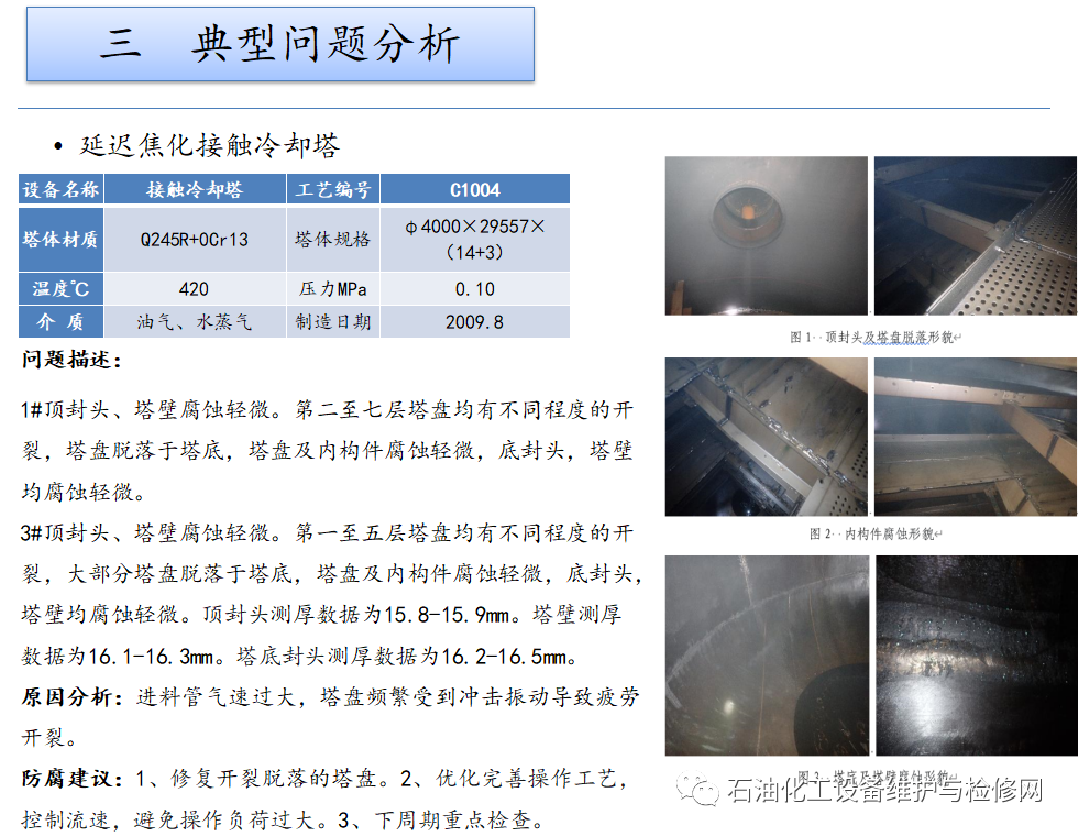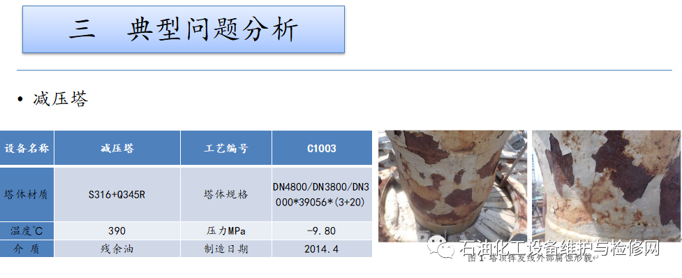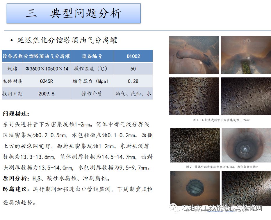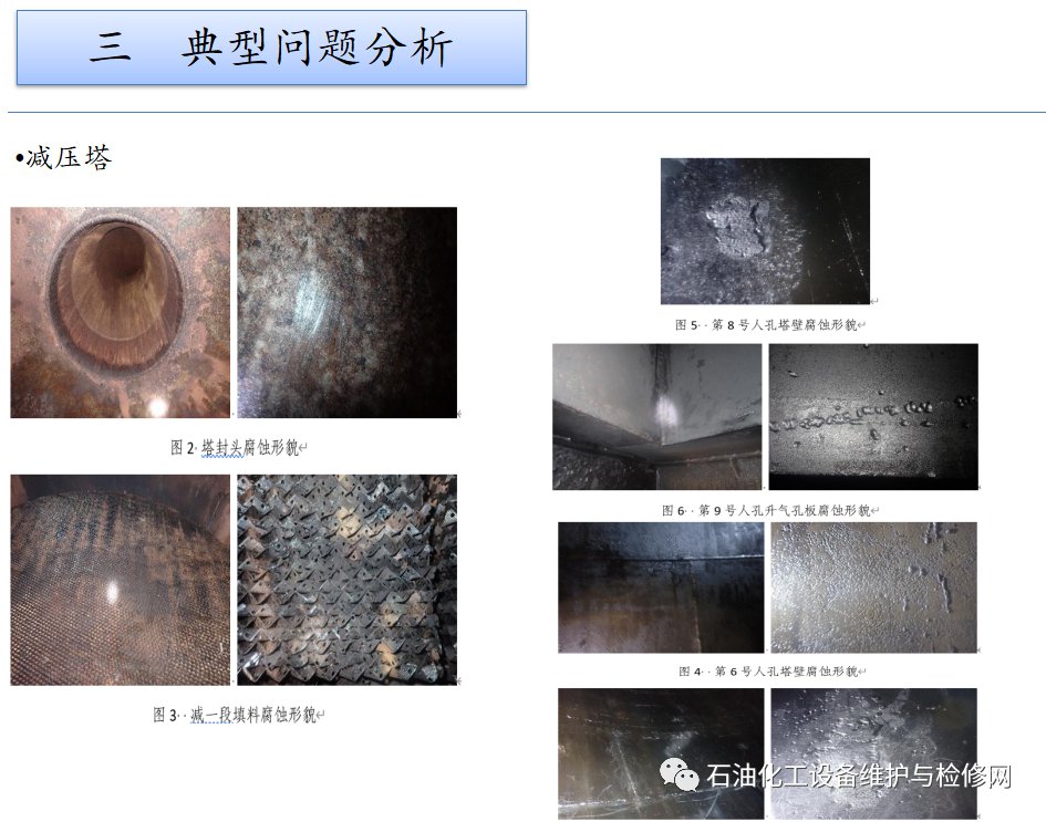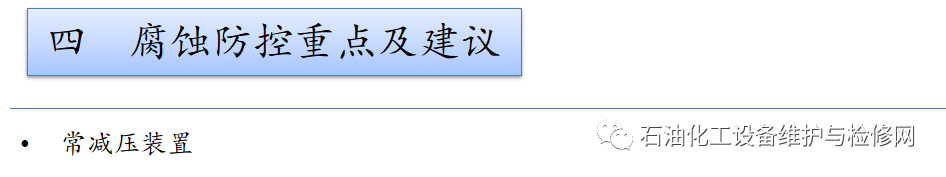常減壓裝置,常壓塔頂循以上部位及其冷凝冷卻系統(tǒng);焦化裝置,分餾系統(tǒng)分餾塔的濕硫化氫腐蝕及水冷器的循環(huán)水垢下腐蝕。