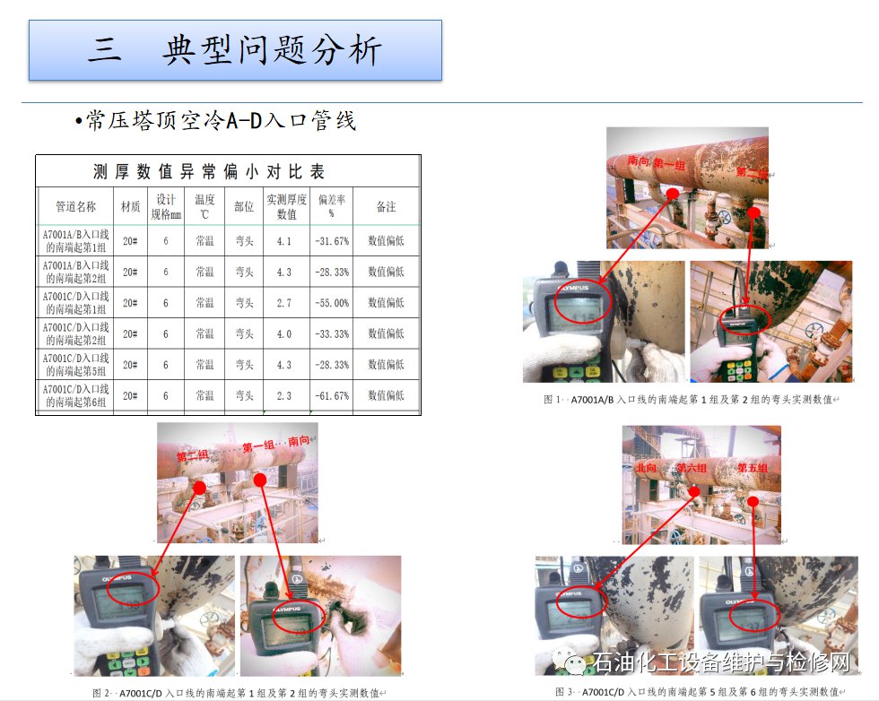 常壓塔頂空冷A/B入口線的南端起第1組及第2組的彎頭實(shí)測數(shù)值分別為4.1-5.0mm和4.3-5.4mm。常壓塔頂空冷C/D入口線的南端起第1組及第2組的彎頭實(shí)測數(shù)值分別為2.7-3.8mm和4.1-5.5mm。第5組及第6組的彎頭實(shí)測數(shù)值分別為4.3-5.1mm和2.3-4.3mm。最小數(shù)值與設(shè)計(jì)規(guī)格相比較,偏差率達(dá)到-20%以上。