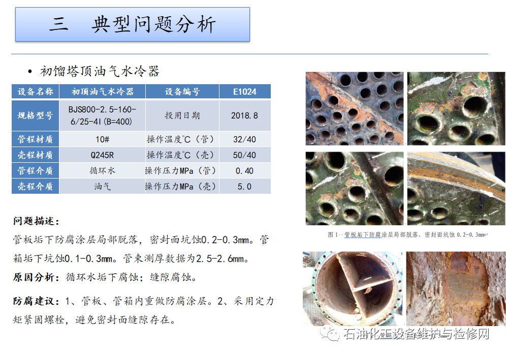 本裝置的大部分設(shè)備和管線均無嚴(yán)重腐蝕問題。主要腐蝕問題集中在水冷器類的循環(huán)水垢下腐蝕,分餾系統(tǒng)低溫部位的濕硫化氫+沖刷腐蝕。