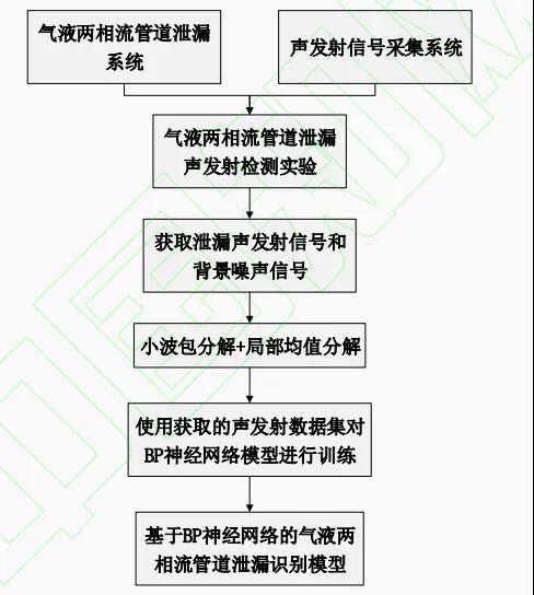 方法框架:針對氣液兩相流管道泄漏的特點(diǎn),結(jié)合聲發(fā)射信號特征提取和近年來流行的神經(jīng)網(wǎng)絡(luò)算法,提出了針對氣液兩相流管道的泄漏檢測方法。