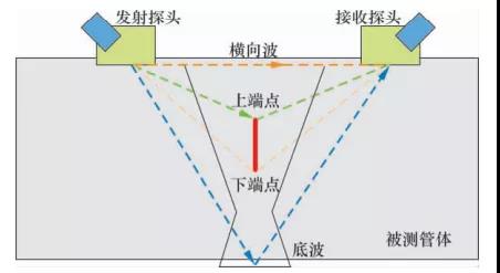 原理:超聲衍射時(shí)差檢測技術(shù)是一種依靠從待檢工件內(nèi)部缺陷上、下“端點(diǎn)”處得到的衍射波在掃描線上的時(shí)差來檢測缺陷尺寸的方法。采用一發(fā)一收的高精密匹配縱波斜探頭進(jìn)行檢測,在被檢測管道的中心線對稱放置。