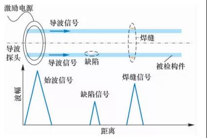 原理:超聲導(dǎo)波在進(jìn)行管道檢測時(shí),導(dǎo)波沿管壁傳播,在管壁橫截面發(fā)生變化處產(chǎn)生反射信號。反射信號的幅度與管壁橫截面積的總變化量有關(guān),通過分析解讀該信號即可判斷管道特征及狀態(tài)。