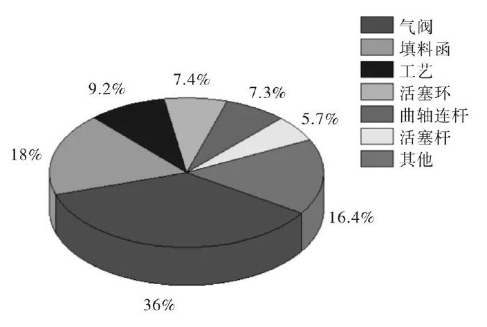 按往復壓縮機引起事故的零部件不同分類,各類故障所占的比例如下圖所示。其中,吸、排氣閥故障概率最高,達到36%;其次,填料函、連桿、活塞桿等引起的事故所占比例也挺高。