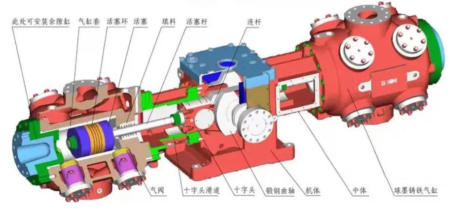 該機構包括十字頭、連桿、曲軸、滑導等——它是主要的運轉和傳動部件件,將電機的圓周運動經連桿轉化為活塞的往復運動,同時它也是主要的受力部件。
