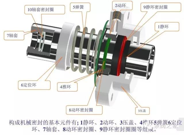 主要有以下四類部件。a.主要密封件:動(dòng)環(huán)和靜環(huán)。b.輔助密封件:密封圈。c.壓緊件:彈簧、推環(huán)。d.傳動(dòng)件:彈箕座及鍵或固定螺釘。