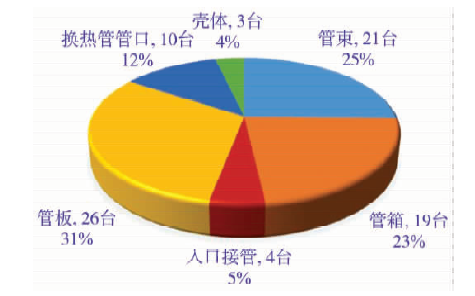 按照冷換設備出現腐蝕的部位進行統計分析,結果如圖2所示。冷換設備的腐蝕主要發生在管束、管箱、管板、換熱管管口、入口接管和殼體等部位,分別占腐蝕案例的25%、23%、31%、12%、5%和4%。其中發生在管束、管箱、管板上的最為突出,合計約占腐蝕案例的79%;易導致冷換設備腐蝕泄漏的部位出現在管束和換熱管管口的案例,合計約占腐蝕案例的1/3。