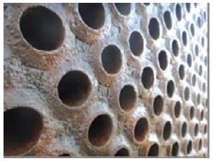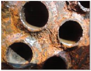 脫硫聯合裝置再生塔頂冷凝器E302AB,操作介質為循環水/貧液,管束材質為00Cr17Ni14Mo2,筒體和封頭材質為16MnR+316L。檢修發現,管箱內結黃褐色硬質垢,垢下點蝕坑深度達0.2~0.4mm(見圖9)