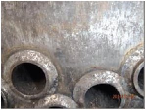 催化分餾塔頂油氣冷凝器E203ABCD管程為循環水。因循環水中微生物控制不力,導致細菌大量繁殖,形成粘泥,吸附水中灰分,附著在設備壁上,產生粘泥下腐蝕和結垢腐蝕,同時,又因換熱器結構不合理,在管子與管板的連接處產生了較大的附加應力,從而造成4臺換熱器的管板腐蝕嚴重且存在開裂現象(見圖5和圖6)。