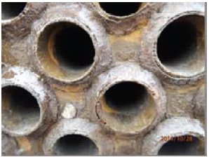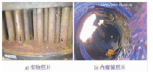 脫硫聯合裝置循環堿液冷卻器E505A,管程為循環水,管束多處出現腐蝕穿孔,穿孔處位于殼程進料口一側、導流筒和管板之間。對管束進行測厚,結果顯示,穿孔處附近厚度為1.5mm,未穿孔處為2.3mm。內窺鏡觀察發現,其管束內壁有片層狀垢物(見圖7)。