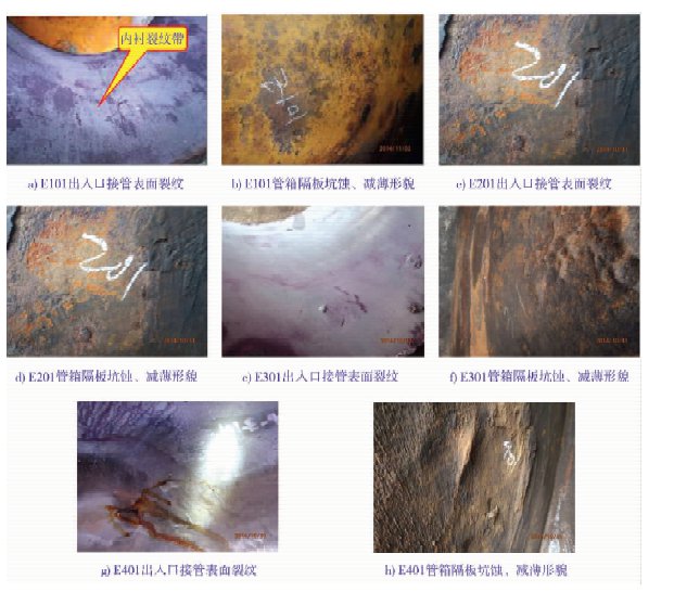 檢修期間發現,管箱內壁污垢、銹蝕較重,隔板及基體布滿蝕坑,隔板中部存在明顯的沖刷腐蝕減薄現象。從測厚情況看,E201管箱隔板沖蝕部位區域測厚值為10.14~10.37mm,其余部位為15.45~15.51mm;E301管箱隔板沖蝕部位區域測厚值為9.51~10.02mm,其余部位為15.32~15.57mm;E401管箱隔板沖蝕部位區域測厚值為6.92~7.12mm,其余部位為13.95~15.51mm。管/箱出入口接管(光譜材質檢測為317L)表面存在裂紋(見圖4)。