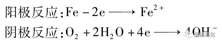 在裝置運行中,保溫層的結構被破壞導致水分進入,保溫材料的多孔結構對水分起到一定的滯留作用,從而在保溫層下形成電化學腐蝕環境。同時保溫材料中含有一定量的Cl和S等元素,加劇了腐蝕,其電化學腐蝕反應方程式如下: