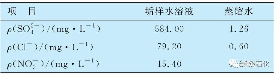 采用超聲波振蕩的方法將定量的垢樣充分溶解于定量的蒸餾水中,然后取上層清液過濾,利用離子色譜法(HPIC)測(cè)定水中的可溶性陰離子,并取蒸餾水進(jìn)行空白對(duì)照。
