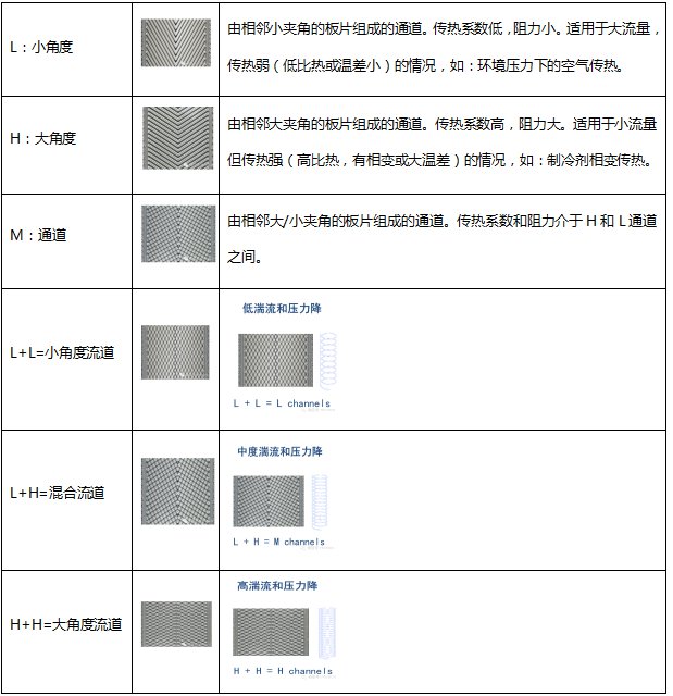 通常有二種波紋的板片 (L 小角度和 H大角度),這樣就有三種不同的流道(L, M 和 H),如下所示: