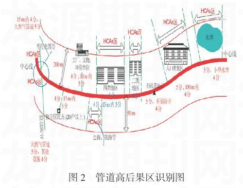 高后果區(qū)是指如果管道發(fā)生泄漏或斷裂等事故,會對公眾安全、財產(chǎn)、環(huán)境、社會等造巨大損失的區(qū)域,隨著人口和環(huán)境資源的變化,高后果區(qū)的地理位置和范圍也會隨著改變。經(jīng)過管線與周邊環(huán)境的相對位置、管線易產(chǎn)生打孔盜油點情況進(jìn)行分析,研究形成了《管道高后果區(qū)評價準(zhǔn)則和評分細(xì)則》,其可視化展示如圖2所示。