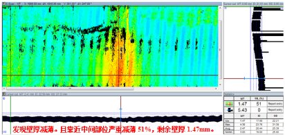 某化工廠的一臺(tái)立式機(jī)組中冷器,其換熱管規(guī)格Φ57×3.5×3500mm,材質(zhì)10#。應(yīng)用IRSI檢測(cè)系統(tǒng)對(duì)該臺(tái)換熱器管進(jìn)行檢測(cè),本次抽檢換熱管20根,發(fā)現(xiàn)所有換熱管都有明顯減薄現(xiàn)象,減薄位置在管子與折流板交接處和全管體隨機(jī)分布的腐蝕坑,在設(shè)備竣工圖紙上查得換熱管的壁厚為3.5mm,而抽查的換熱管檢測(cè)中壁厚減薄量高達(dá)32%的管壁厚,該最大減薄處剩余壁厚為2.39mm,如圖5所示。