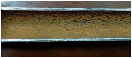 某化工廠的一臺(tái)脫光氣塔頂空冷器,其換熱管規(guī)格Φ25×3×6000mm,材質(zhì)10#。應(yīng)用IRSI檢測(cè)系統(tǒng)對(duì)該臺(tái)換熱器管進(jìn)行抽查檢測(cè),發(fā)現(xiàn)下管板部分換熱管沒有減薄現(xiàn)象,剩余壁厚均勻分布,見圖3-1所示;而上管板部分換熱管存在明顯減薄,且管中間部位嚴(yán)重減薄,主要表現(xiàn)在內(nèi)壁減薄,減薄量超過50%換熱管壁厚,剩余壁厚1.47mm左右,典型圖譜如下圖3-2所示。且對(duì)其中指定的一根換熱管進(jìn)行抽管驗(yàn)證,證明實(shí)際腐蝕與檢測(cè)結(jié)果基本吻合,圖4為該驗(yàn)證換熱管解刨后的內(nèi)壁實(shí)際腐蝕狀態(tài)照片。