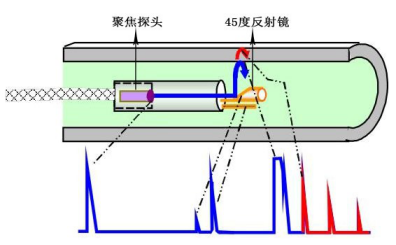 儀器主機(jī)、渦輪旋轉(zhuǎn)頭、對(duì)中裝置、定位裝置、耦合裝置、水流管適配器、水浸聚焦探頭、聲反射鏡和目標(biāo)針等部件是旋轉(zhuǎn)超聲檢測(cè)系統(tǒng)的主要組成部分,其原理是基于脈沖回波檢測(cè)法,探頭激發(fā)一個(gè)高頻脈沖在水中產(chǎn)生超聲波,一個(gè)反射鏡將超聲波反射90度變成垂直管壁方向波束,在管子內(nèi)外表面都會(huì)反射回來的一個(gè)回波,內(nèi)表面回波與外表面回波的時(shí)間和波幅經(jīng)系統(tǒng)數(shù)字化處理后,通過計(jì)算就可以得到管子的內(nèi)徑、外徑和壁厚。適用于碳鋼,304不銹鋼,316不銹鋼,銅等所有能傳遞超聲波信號(hào)的金屬和非金屬材料。圖1為IRIS檢測(cè)示意圖。