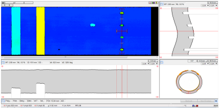 旋轉(zhuǎn)超聲的檢測(cè)過程是先由專業(yè)清洗工將換熱器管束清洗干凈,再將管束的一端用塑料堵頭封堵,另一端往管束里充滿水,然后將探頭的對(duì)中裝置推入管子內(nèi)部,通過耦合水泵推動(dòng)渦輪傳動(dòng)裝置帶動(dòng)聲反射鏡自動(dòng)旋轉(zhuǎn),在水中形成垂直于管壁的入射波束,對(duì)管束進(jìn)行周向掃查;通過手動(dòng)一邊均速拉出對(duì)中裝置,檢測(cè)系統(tǒng)一邊同時(shí)采集數(shù)據(jù),采集到的數(shù)據(jù)能提供管束腐蝕的準(zhǔn)確位置,能實(shí)時(shí)顯示其橫截面圖(B掃描)、管壁展開圖(C掃描)、以及管子縱向截面圖(D掃描),如下圖2所示。