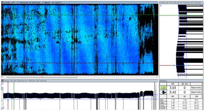 渦輪轉(zhuǎn)速對(duì)于檢測(cè)信號(hào)亦有很大影響,渦輪轉(zhuǎn)速不均勻會(huì)使圖譜不連續(xù),可能導(dǎo)致管束缺陷特征信號(hào)的遺失,從而造成漏檢,因此,每次檢測(cè)前必須在樣管上調(diào)整好渦輪轉(zhuǎn)速。圖6中長條狀黑色帶即為渦輪轉(zhuǎn)速不均勻造成的。